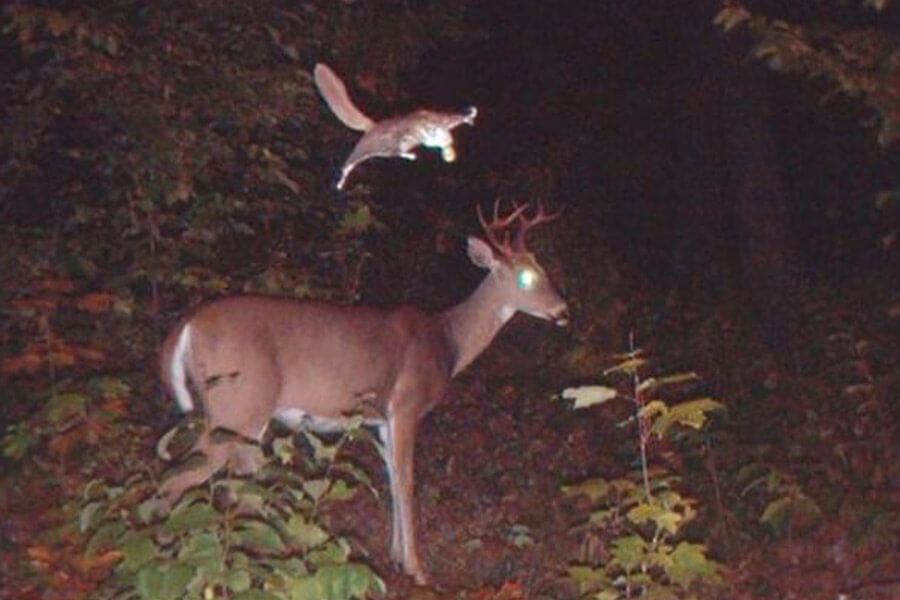 This trail cam was either set off by the deer or the bird. Wait, that's not a bird; it's a squirrel! What kind of mad science is this? We assume this squirrel thought flying over the deer was the fastest way back home.