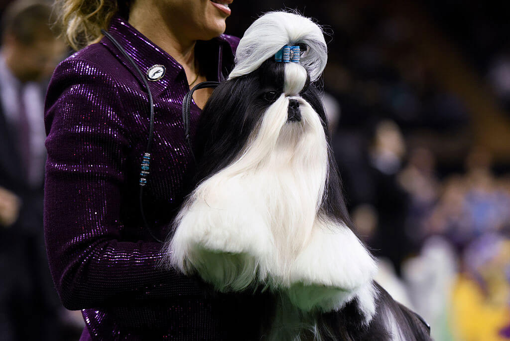 The Shih Tzu breed has been entertaining dog lovers for almost 1,000 years now, and their popularity doesn't seem to be going away anytime soon. Originally bred in Tibet, Shih Tzus are easily recognizable by their long and silky "fancy" coats. They weigh in around 10-15 pounds and are usually about 9-10 inches tall.
