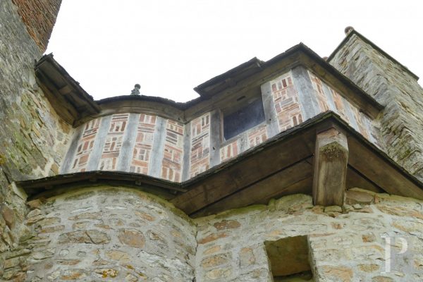 Many of the first floor rooms have large and small holes in the walls that allowed a gun to be shot at almost ground level to defend the castle. The pavilions are made of half timbering on the top and also feature rooms with old granite block fireplaces.