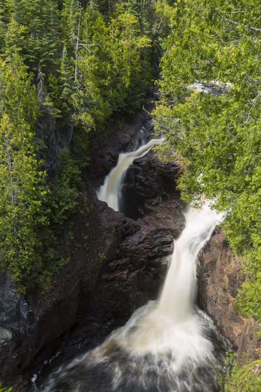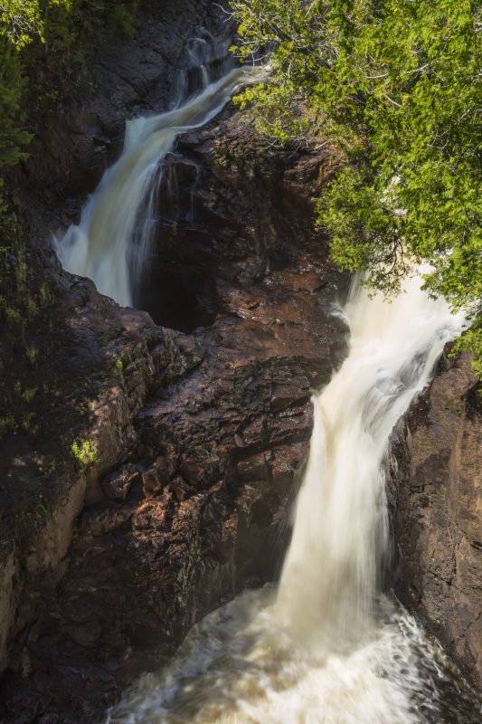 The Brule River, flowing through the state park, drops 800 feet over eight miles, which causes some interesting waterfall features. Around a mile north of Lake Superior there is a thick outcropping of rhyolite rock that splits the river into two, foaming waterfalls.