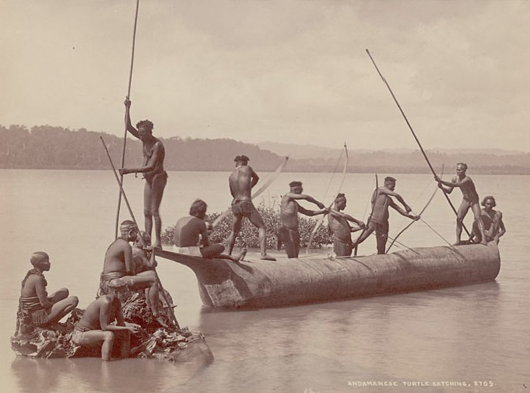 Group of Andamanese hunting turtles with bows and arrows