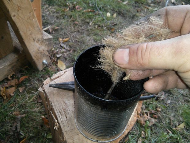 The second ingredient is fibre. Plant fibre will turn your tar into a type of fibreglass, adding to its strength dramatically. Any plant fibre will work, however for mine I cut up some jute twine, broke up the fibres and cut them into very small 1/8″ pieces. How much you use is a matter of preference. More fibre means stronger glue, but the end product is lumpy, while less fibre means a smoother finish yet not quite as strong. I’d recommend adding small amounts slowly as you go.