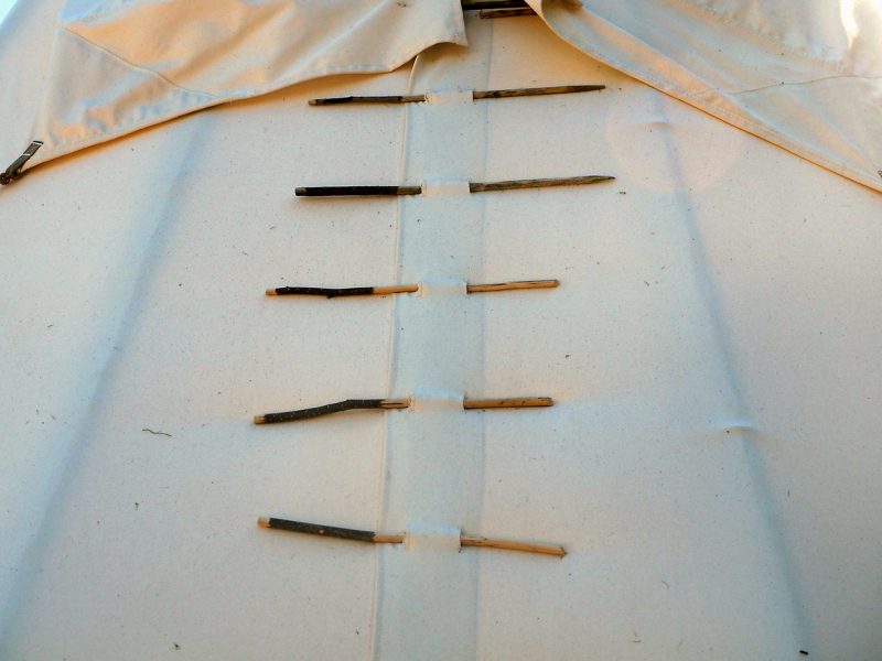 Where the teepee joined together it was connected with lacing pins. Think of holding a model of a teepee together with large sewing pins below the door and between the door and smoke hole. That’s essentially the idea, except that these pins would go through holes that were cut and bound into the covering – much like buttonholes.