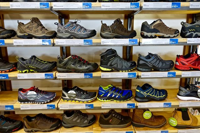 When trying on shoes, wear the socks you will wear when hiking. The shoe needs to fit snugly enough that your foot doesn’t slide about while you don’t want it so tight you strangle your foot.