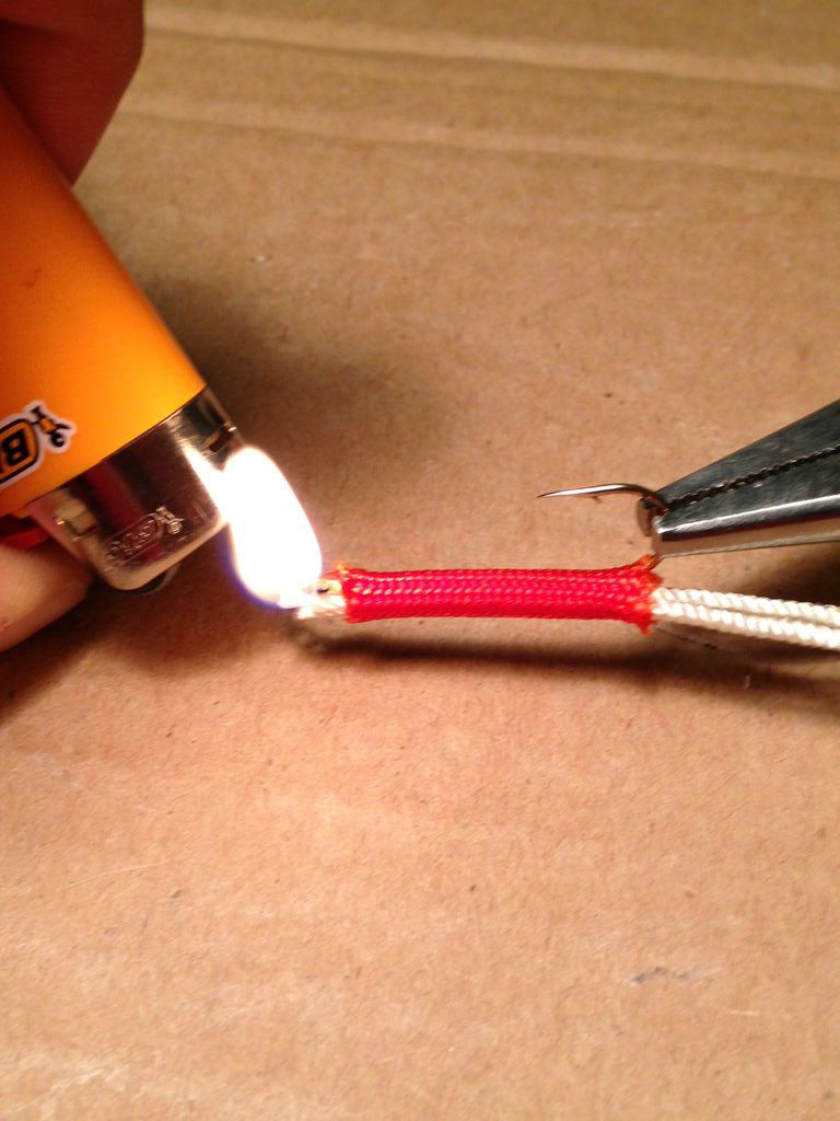 Make sure the eye hook at the end of the hook is exposed. Don’t melt the paracord over it.