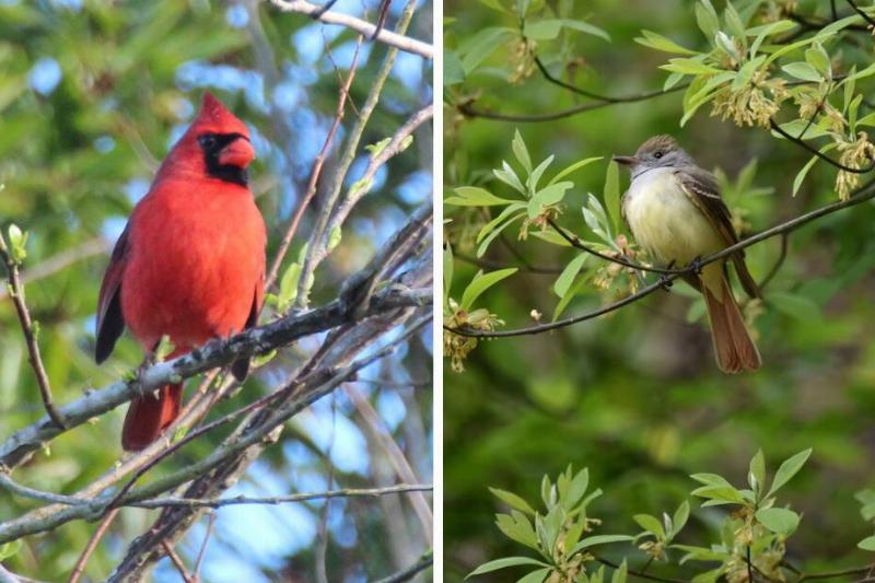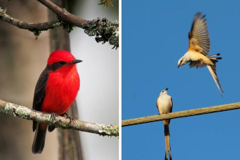 The bird scene here is colorful and full of surprises. In Arizona and New Mexico, you might see Vermilion Flycatchers and even Painted Redstarts if you're lucky. Cactus Wrens chatter from thorny shrubs, and Greater Roadrunners can be seen dashing across driveways. In Texas, Scissor-tailed Flycatchers flash their long tails from fence lines, and hummingbirds, every kind you can think of, dart through flowers. And Oklahoma fields are also full of Western Kingbirds and Dickcissels. The birds here are as tough and beautiful as the land.