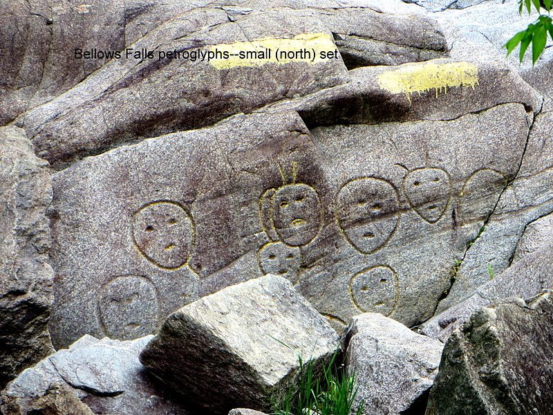 Bellows Falls is a place where you can see two clusters of petroglyphs, 50 feet south of the Vilas Bridge that crosses Connecticut River. These unusual carvings depict round heads with minimalistic eyes and mouth. According to the researcher David McClure, these heads were carved by the ancient people known as the Abenaki. They were carving the evil spirit faces in the rocks to show them the way to the afterlife.
