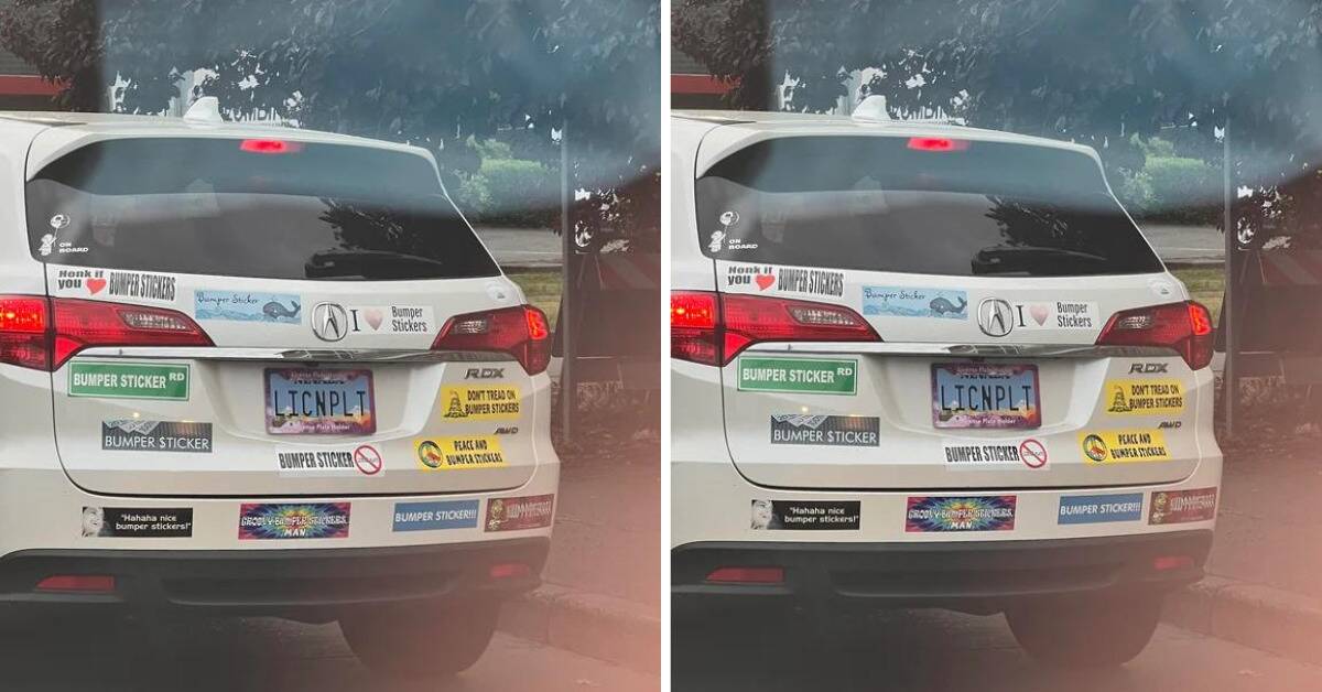 Some drivers stick to one message with their bumper stickers, while others seem determined to slap as many stickers onto their cars as possible. I think we all know which category this driver falls into.