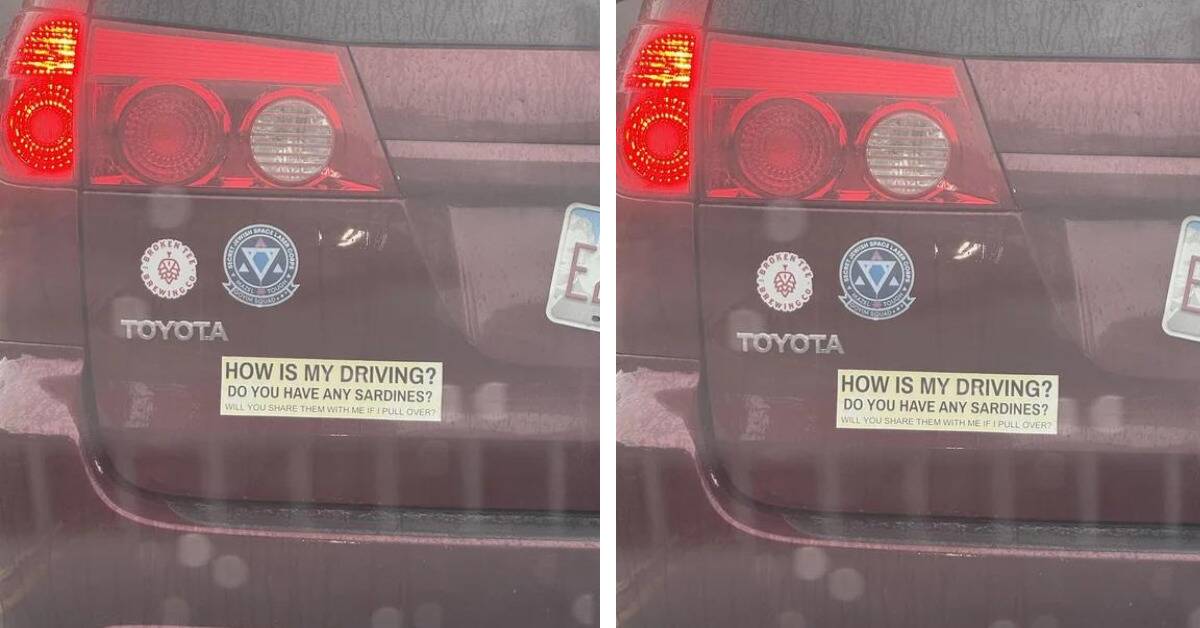 This bumper sticker starts out in an expected direction, then it takes an interesting turn. No, I don't have any sardines, sorry — but reading that distracted me from whatever the initial point was.