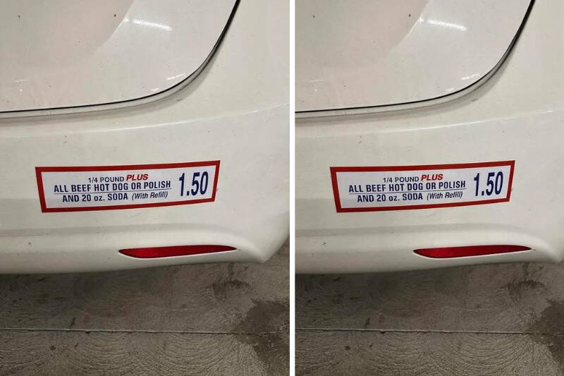 Why is this car advertising an incredibly good deal on an all-beef hot dog (or Polish) and a soda? It's simply a tribute to Costco's legendary hot dog deal, which I can definitely support.