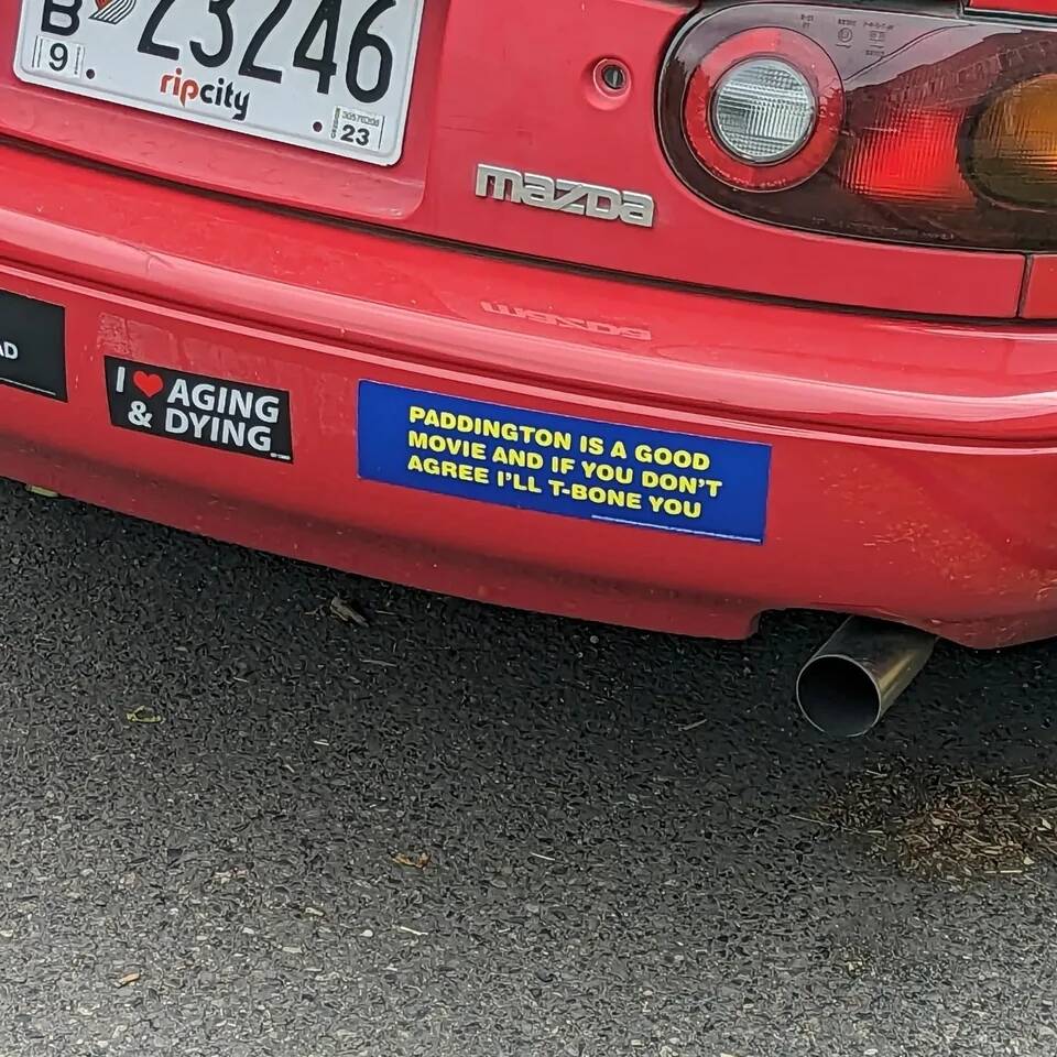 I've never seen Paddington, but the books are downright delightful. Is this a brave opinion or not? I'm really not sure. Also, shout-out to the bumper sticker on the left.