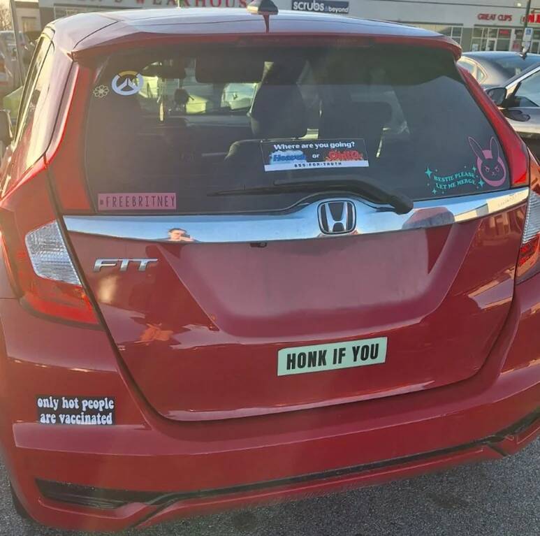 I'm a simple person: If I see a bumper sticker urging me to honk if I meet a certain criteria, I'll honk (if I meet that criteria, of course). This bumper sticker is just leaving us all in suspense. I honk therefore I am?