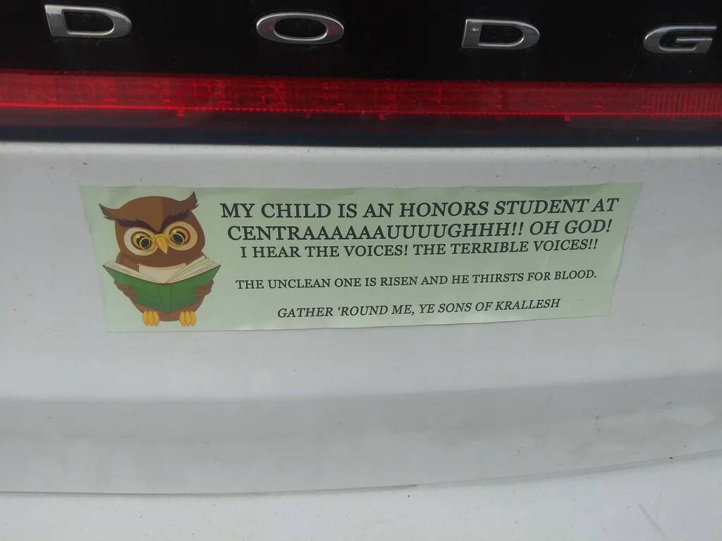 Most of us probably roll our eyes when we see those "My child is an honors student" bumper stickers, so it's nice to see a twist on the tired formula...even if it does leave us with more questions than answers.
