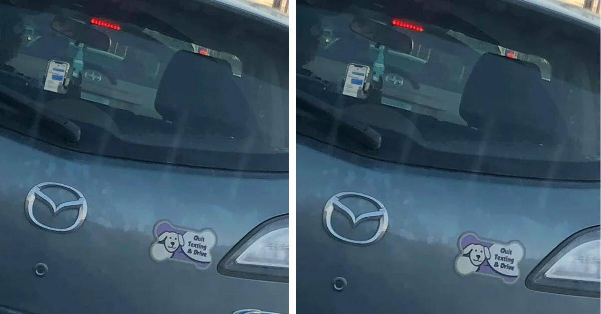I think most of us can get down with the 'Quit texting and drive' message. It's a safety concern, after all. That said, if you look at the driver of this car, they're not practicing what they preach.