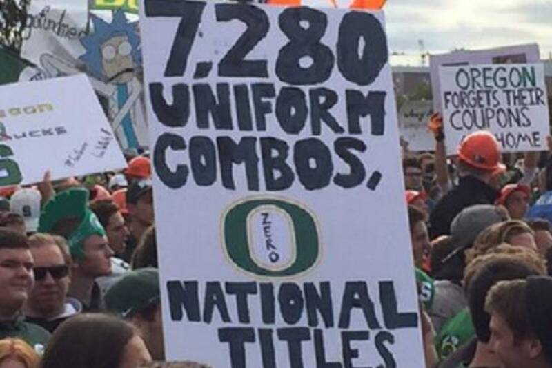 While it's hard to find examples of Oregon wearing the same uniform twice, it's even harder to find examples of Oregon winning any college football national championships. That's because they haven't won any.