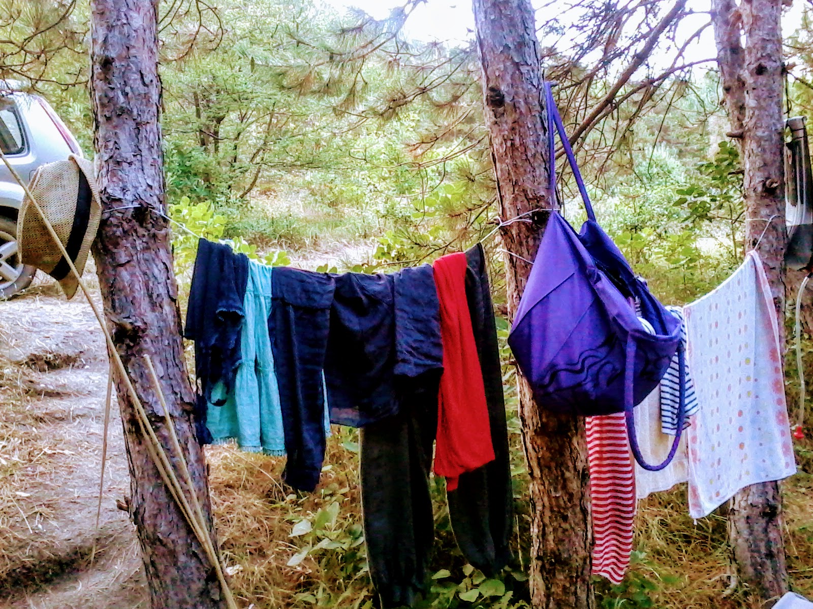 Try to get some air to your clothes and your sleeping bag. If it’s sunny, use the opportunity to hang your things outside and dry them. Fresh air will help neutralize any odor.
