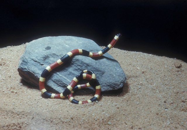 Coral snakes, while also venomous, are the exception when it comes to the above characteristics. Their pupils are round and not slit. Their heads are also rounded and not flat. The coloring is yellow, red, and black. There are non-venomous snakes with this coloring also, but this rhyme is well to remember – “Red on yellow, kill a fellow.”